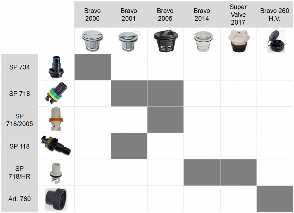 | Bravo 2005 | Один из самых распространённых клапанов | SP 718/2005 или SP 718 | Очень популярная модель на лодках ПВХ и надувных изделиях |